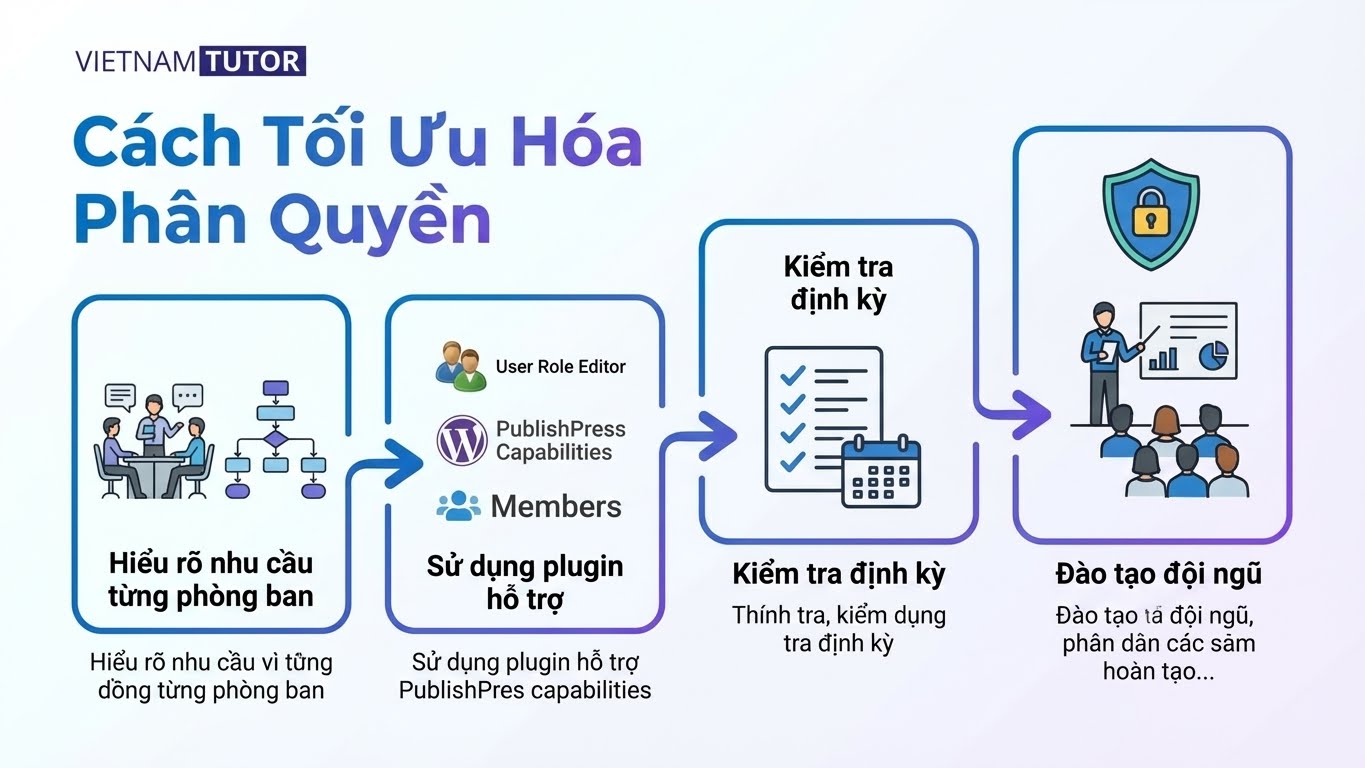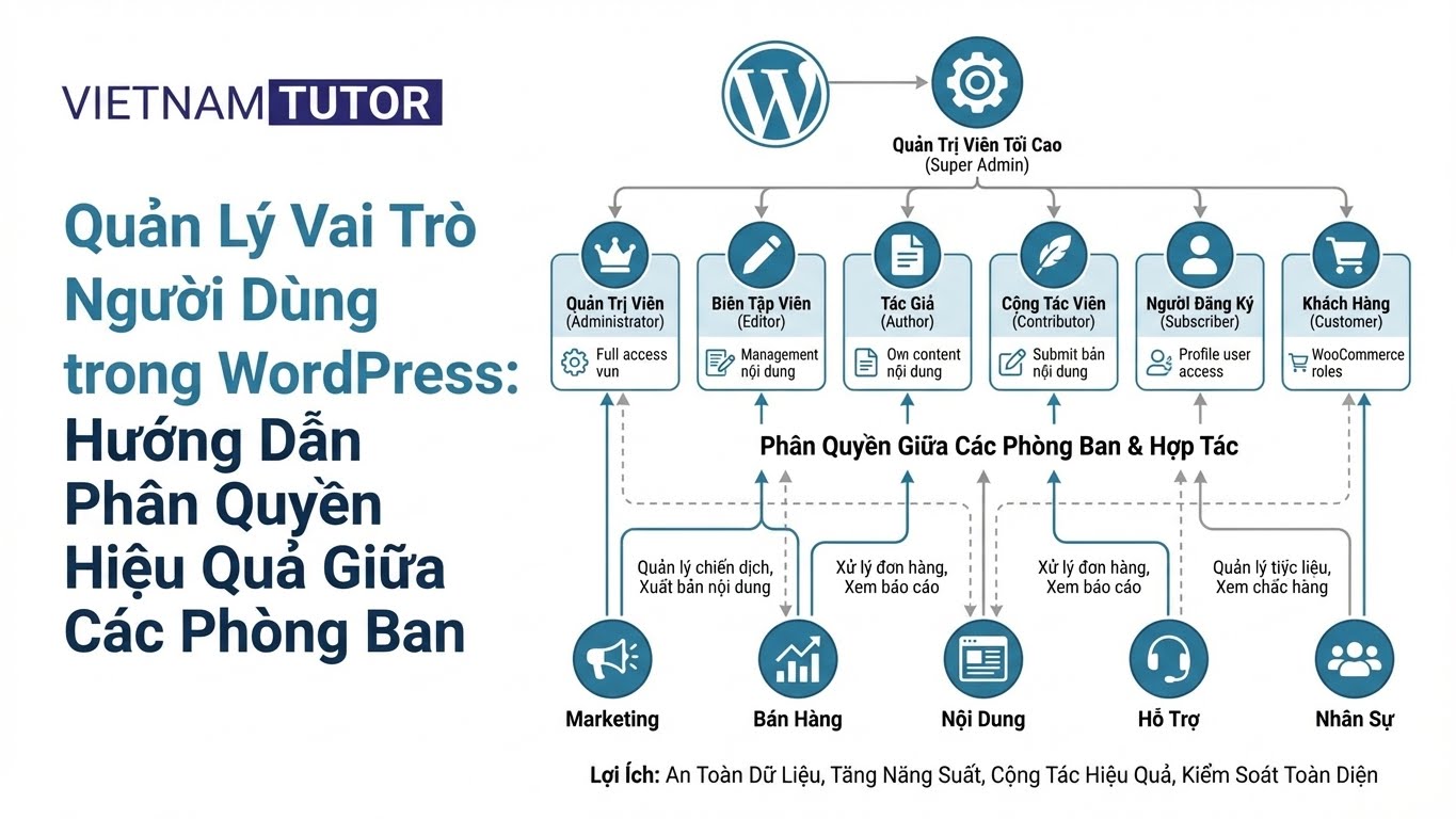 Với hơn một thập kỷ làm việc với WordPress, tôi đã chứng kiến nhiều doanh nghiệp gặp khó khăn trong việc quản lý quyền truy cập website giữa các phòng ban. Một hệ thống phân quyền người dùng (user roles) được thiết lập đúng cách không chỉ giúp vận hành website mượt mà mà còn tăng cường bảo mật và hiệu quả làm việc nhóm. Trong bài viết này, tôi sẽ chia sẻ cách sử dụng các vai trò người dùng trong WordPress để phân quyền hiệu quả giữa các phòng ban, với hai trường hợp cụ thể: blog công ty và website thương mại điện tử sử dụng WooCommerce. Bài viết dành cho các quản trị viên WordPress muốn tối ưu hóa quy trình quản lý website.